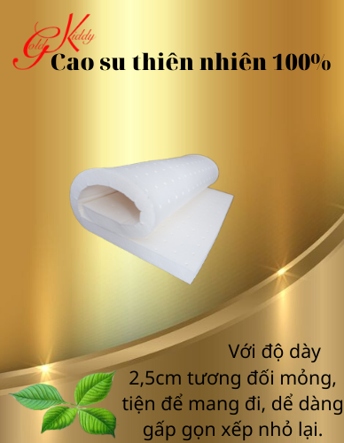 - Đặc biệt bố mẹ yên tâm vì nhờ độ đàn hồi tốt của nệm cao su thiên nhiên Gold Kiddy nên mặc dù chiều dày của nệm chỉ 2,5cm nhưng sẽ không bị lún trũng khi nằm lên, mà rất êm ái dễ chịu.